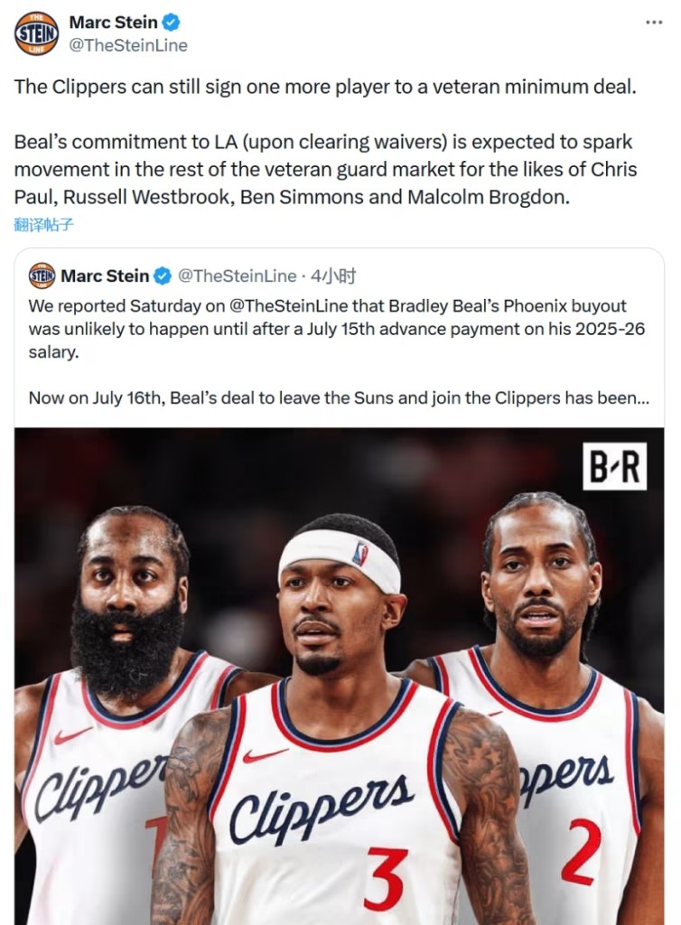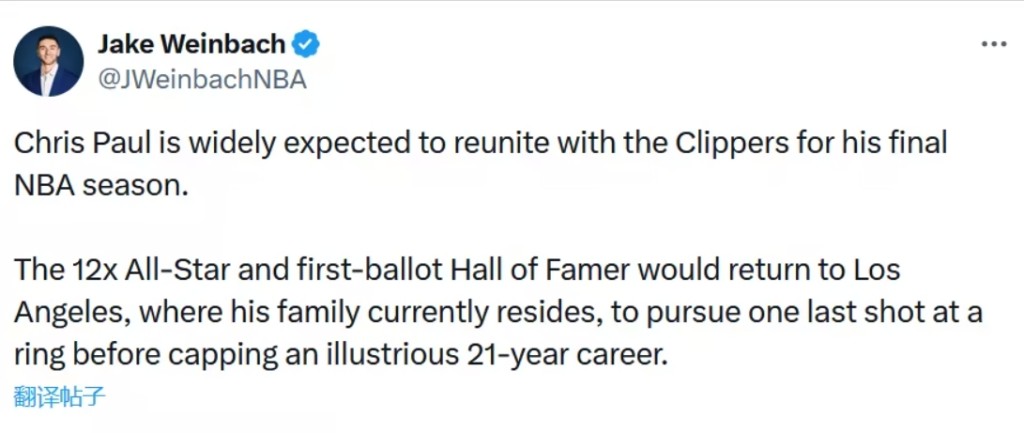 而在有可能加盟快艇隊的老將中,保羅(Chris Paul)無疑是最被看好的一人。保羅今年夏天是自由球員,他迄今為止還沒有做出自己的決定,他的名字一直和快艇隊糾纏在一起。據著名記者Jake Weinbach發推寫道:「外界普遍認為保羅將在其最後一個NBA賽季重返快艇隊。這位12次入選全明星、毫無懸念的未來名人堂成員將回到目前家人定居的洛杉磯,在結束輝煌的21年職業生涯之前,為衝擊總冠軍做最後一搏。」
