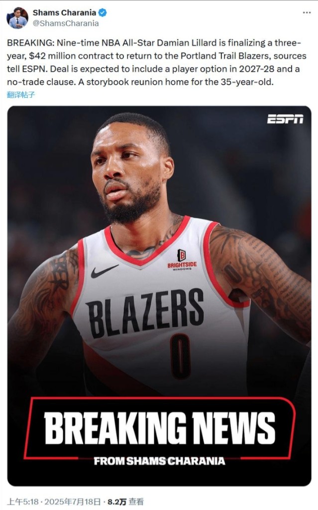 7月18日,NBA進入休賽期。據名記Shams報導稱,35歲老將里拉德(Damian Lillard)加盟拓荒者隊。他此前曾為拓荒者隊效力長達11個賽季,如今迎來了回家,並且將和哈勒戴、楊瀚森成為隊友。